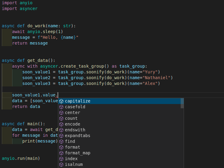Because of the way Asyncer is designed, you will get typing support in these SoonValue objects and their soon_value1.value attribute.
